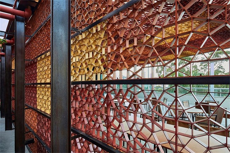 海德利设计公司专门为该餐厅设计的金属板制成的巨大格栅天花板吸引了顾客的注意。在网格面板上,有几层泡沫覆盖着透明的织物,以便更好地反射光线。面板涂有类似于火焰的黄色,红色和橙色的渐变颜色。