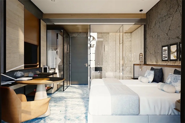 客房内用灰色岩石风貌的石材打造床头区域,并搭配浅木色调壁面,创造出充满中式质感的自然肌理,在朴实中透露着温情。