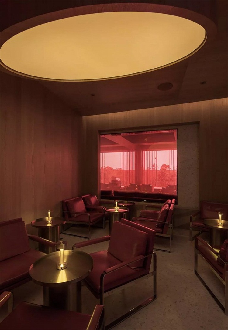 室内分成了lounge跟就餐两个区域。lounge区域较高,坐在这里的客人在品酒的过程中也能更好的将整个深圳湾公园的美景收入眼底,他们坐下后视野的高度与刚进酒吧的客人视线高度一致,形成了有趣的互动。同时,雪茄房内的圆顶灯透过暗红色的玻璃跟门口的玻璃装置的倒影交融在一起形成美妙的风景。