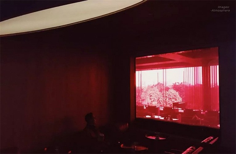 酒吧区域的背景是一面十几米长的整体暗红色玻璃,为整个空间带来红色的热情的调性。红色玻璃的背面是VIP房,以材料特有的属性低调的透出藏在玻璃后的另一个空间。