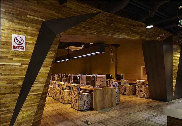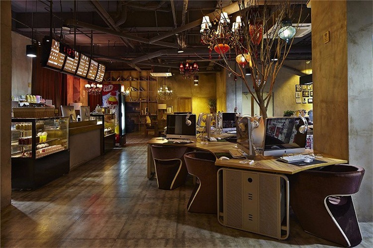 在细节的处理上,更彰显出网咖的独特魅力。水泥“MANWEI”标志墙被横向切割,衍生出激情燃烧的站台,寓意出形散神不散的西方哲学。墙体别致出众,打造的烟斗绅士完爆美学,直接裸露的管道将工业感进行到底。除此之外,多边形的老榆木桌子、枝桠蔓延的树木、老式工业台面、铁皮桶吊灯等元素,亲近了自然,糅合了科技。