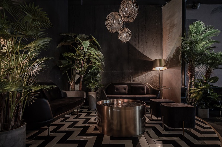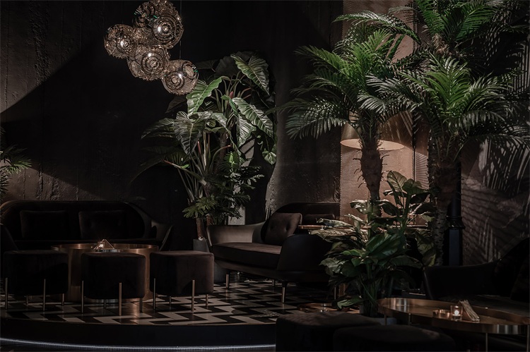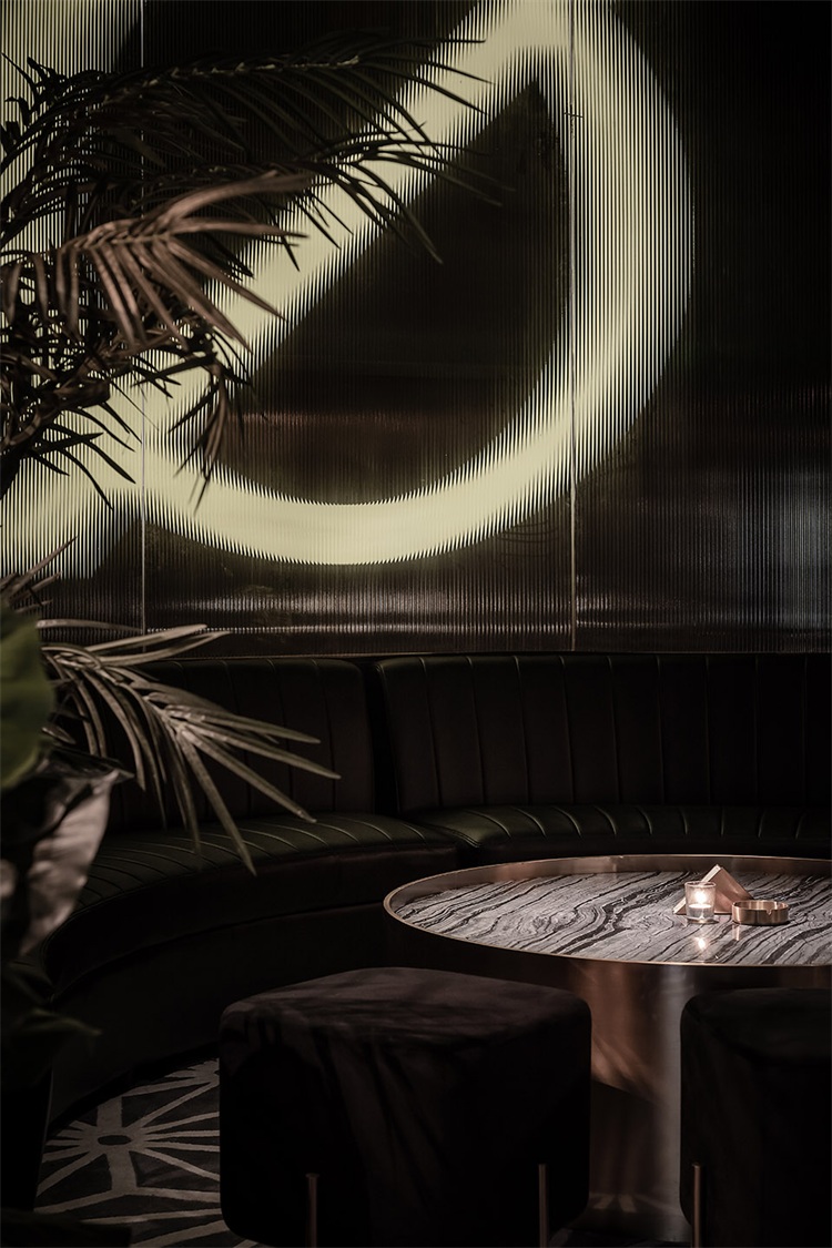 圆形的吧台为整个空间的核心区域,这个形状可以更好的让全场的座位都感受到吧台区域的氛围,吧台设计以旋转木马为概念,通过灯光及镜面材质的运用,将整个空间的客人拉到华丽自由的氛围当中。围绕着吧台的通道让吧台、酒墙、沙发区紧密贴合,人与人的距离在空间的压缩中产生了期待已久的温度。